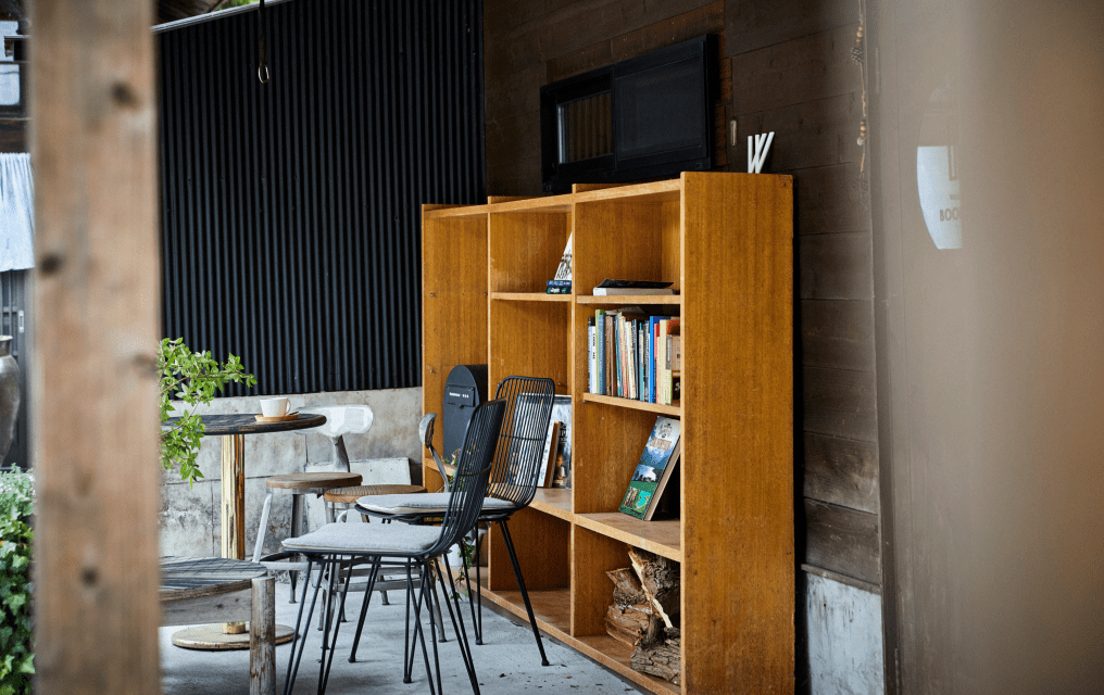 テラス席に、地域の保育園から譲り受けた棚を、マイクロライブラリーとして設置しています。おすすめの本をお持ち寄りいただければ、訪れる皆さんの想いが繋がります。