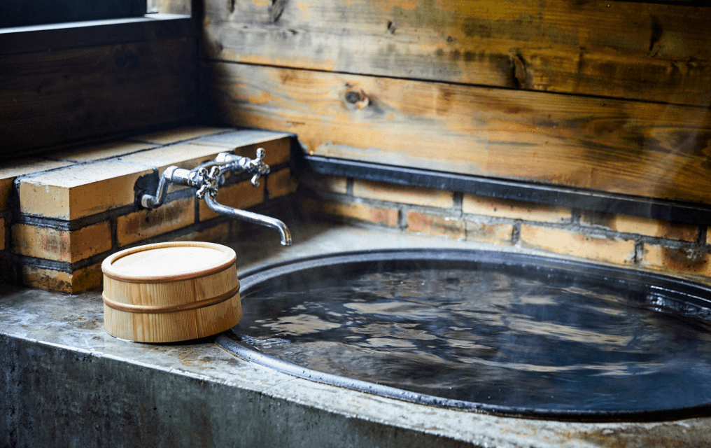 春はヨモギ湯、夏はミント湯。秋はユズ湯に、冬はヒノキ葉湯。鋳物の釜でつくる秘密のレシピは、摘んでお湯に入れるだけ。薫り、せせらぎ、肌ざわり。お湯加減は五感にたずねて。